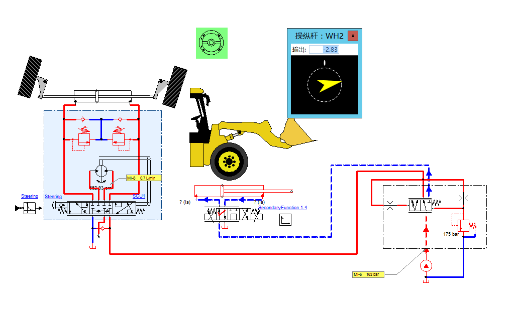 * **复合动作**:模拟同时进行满舵转向和最大速度举升大臂,通过仿真曲线精确观察转向油路的压力和流量是否稳定,从而确保方案的绝对可靠性。