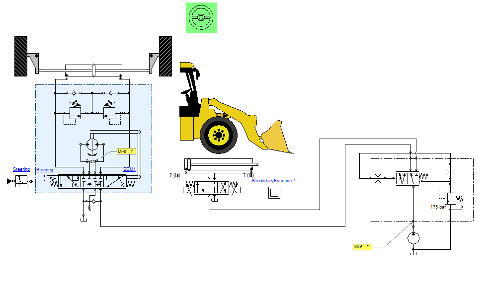 图中用Automation Studio绘制的液压系统原理图,展示了一台轮式装载机,其液压系统包含一个泵、一个优先阀、一个转向系统和一个辅助工作油缸。