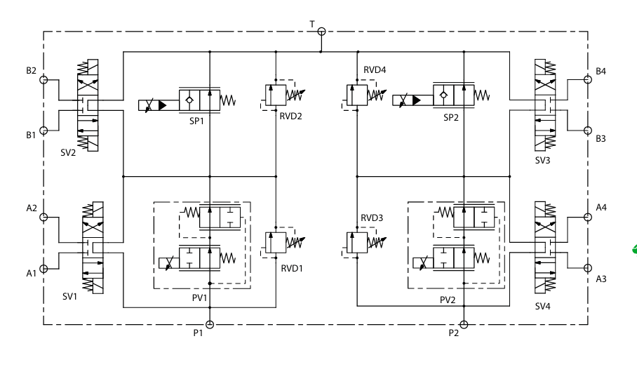 - SV1–SV4:三位四通电磁换向阀(3-position, 4-way directional solenoid valves)